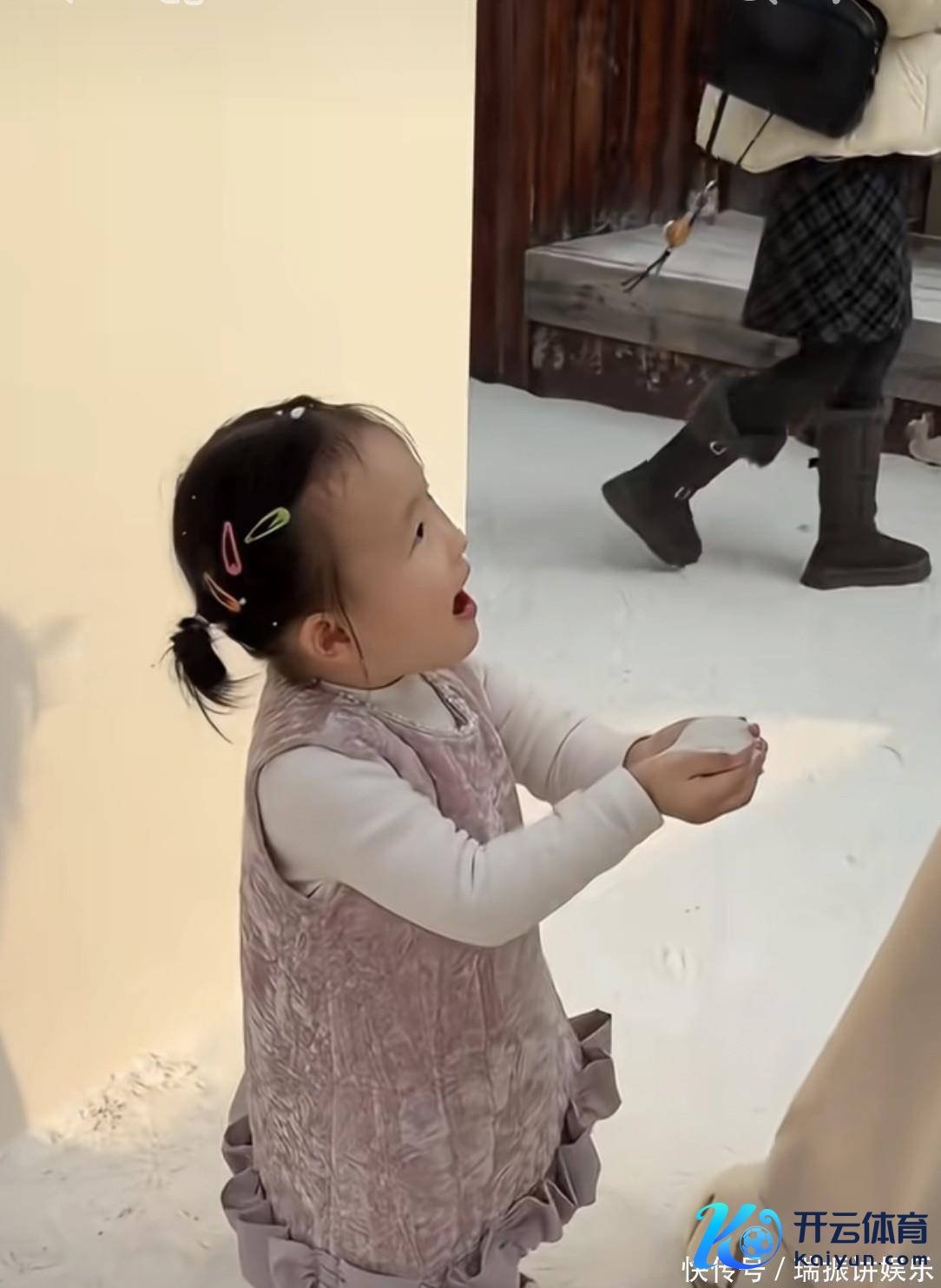 黄一鸣全程跟在男儿身边,怕她滑倒,一手轻轻护着闪闪的后背,一手拿着透明雨伞,既不挡住孩子看雪的视野,又能帮她挡掉飘来的小雪花。