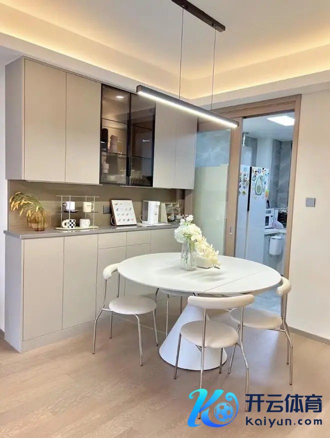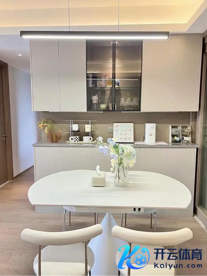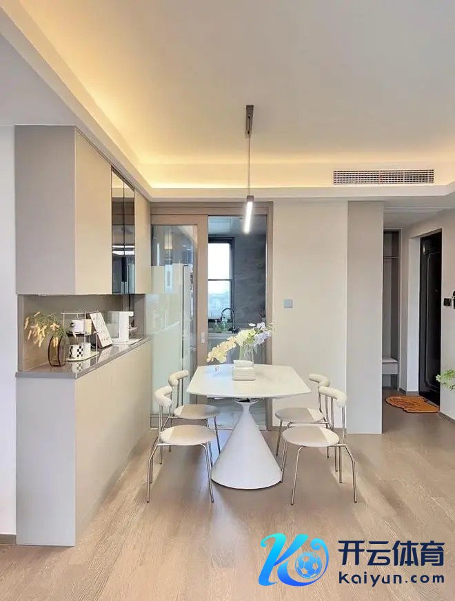 客餐厅一神气诡计,顶面用灯带作念分层处置,灯槽侧面笔直用窄窄的石膏板收边,不添加任何线条,让顶面更检朴。