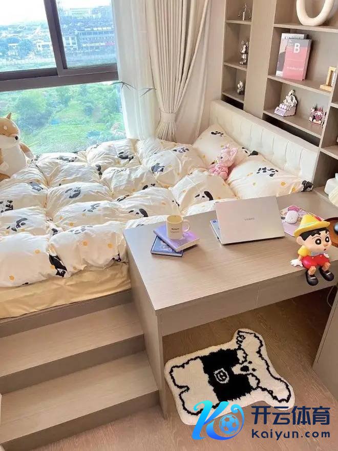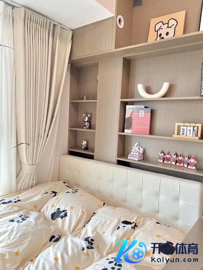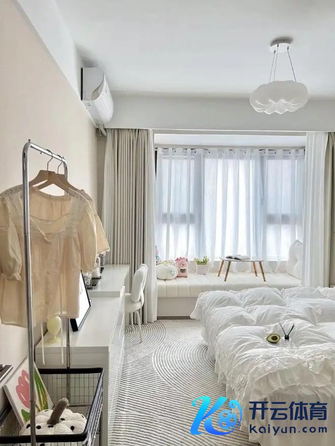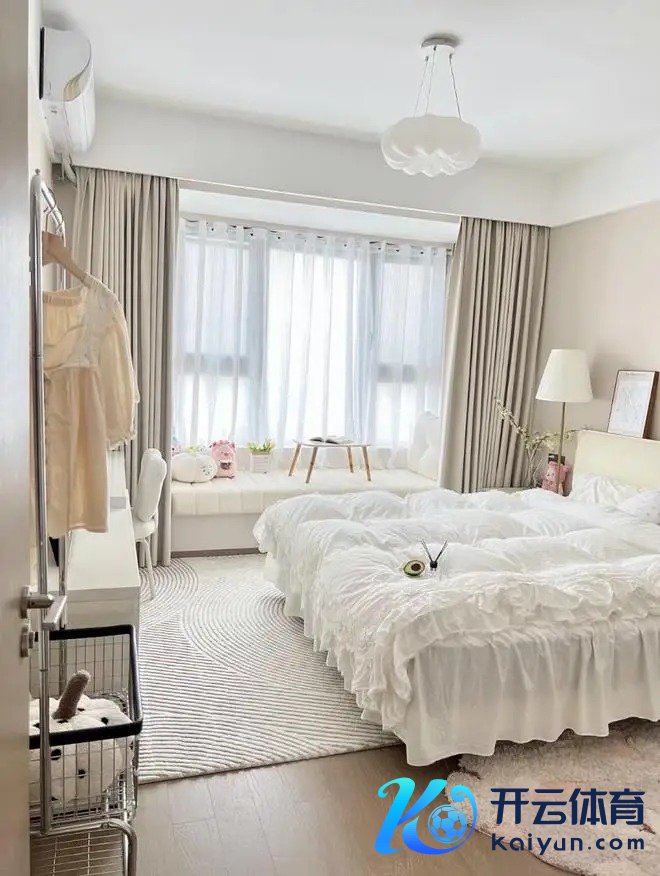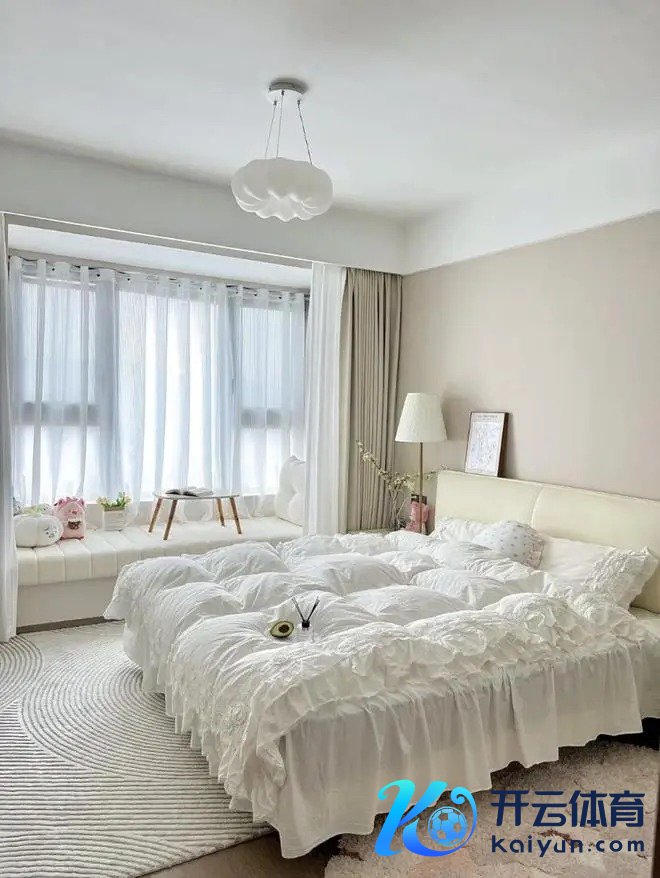 床尾舍弃梳妆台➕斗柜一体正合适,实用又好意思不雅。飘窗铺上泰迪绒飘窗垫,奶呼呼的很自在,平时可坐那晒太阳、看书,自在极了。