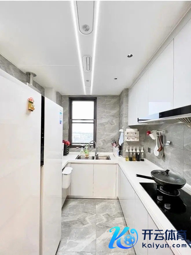 U字型厨房布局,将雪柜收纳进厨房,橱柜只在右侧墙面作念了吊柜,其余空间不作念吊柜,让厨房上半部分更通透。
